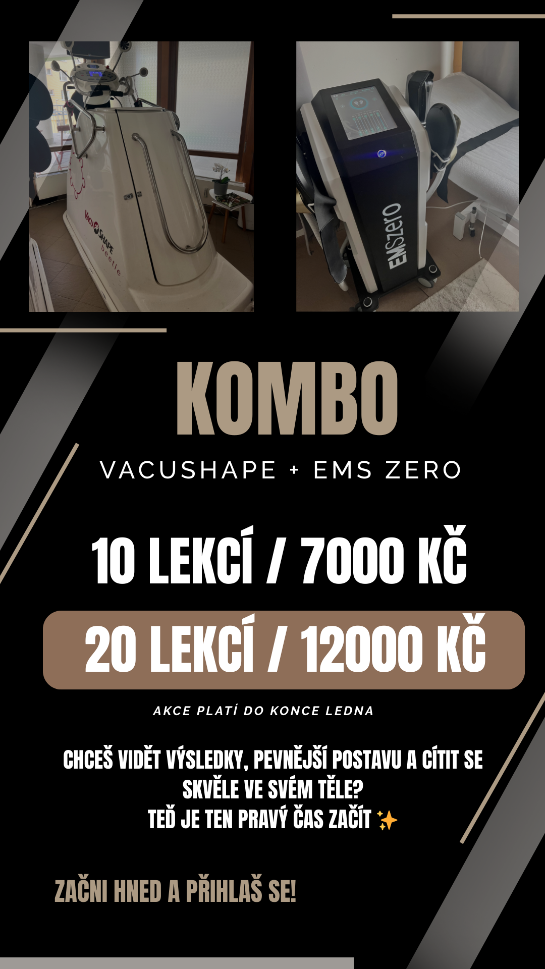 Akce na leden. Kombo = kombinace Vacushape a EMS Zero. Kombinace při které spaluješ a zpevňuješ postavu. Neváhej a přihlaš se. Akční cena 20 lekcí za 12000 Kč platí pouze do konce ledna.